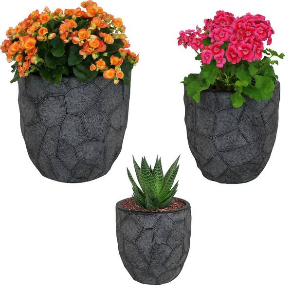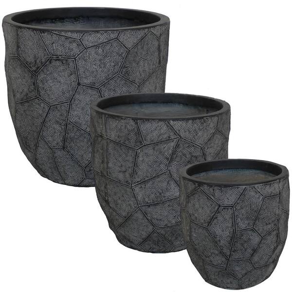 Set Homestead Dark Gray Carved Stone Fiber Clay Planter Flower Pot, Durable Indoor/Outdoor Use (3-Piece)