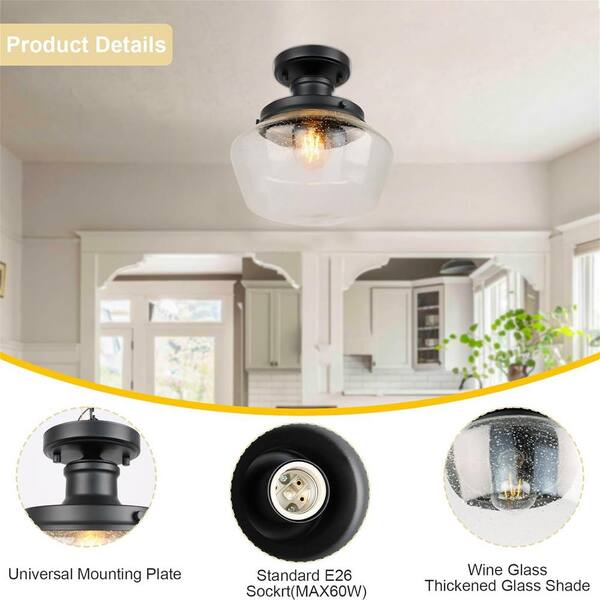 10 in. W 1-Light Semi-Flush Mount Ceiling Light Fixture with Seeded Glass Shade, E26, Bulbs Not Include, Black