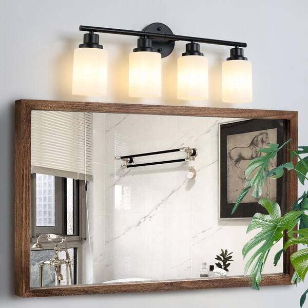 24.4 in. W 4-Light Vanity Lighting Fixture Mirror Light, Frosted White Glass with Black Frame, E26, No Bulbs Included