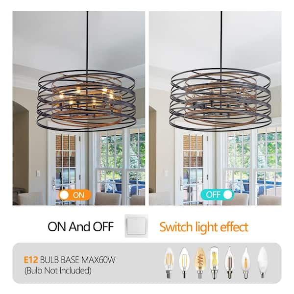 24 in. W 6-Light Pendant Light with Metal Cage for Kitchen Island Dining Room E12 No Bulbs Included (Walnut+Black)