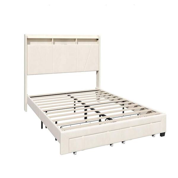 Beige Metal Frame Full Platform Bed with Smart Charging Station, LED Lights, Storage Drawers, Velvet Geometric Headboard