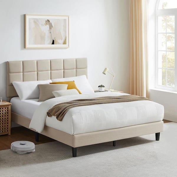 Beige Wood Bed Frame Full Panel Bed with Adjustable Headboard, No Squeaks, Easy to Assemble, No Box Spring Needed