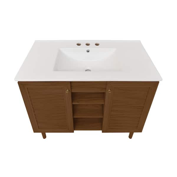 Bron 36 in. Freestanding Bathroom Vanity in Brown Oak with White Ceramic 3-Hole Widespread Sink Top