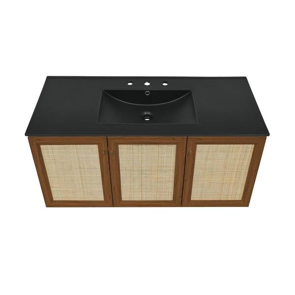 Classe 48 in. Wall-Mounted Bathroom Vanity in Brown Oak with Black Ceramic 3-Hole Widespread Sink Top