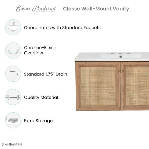 Classed 36 in. Wall Hung Bathroom Vanity in Brown Oak with White, 3-Hole Ceramic Sink Top