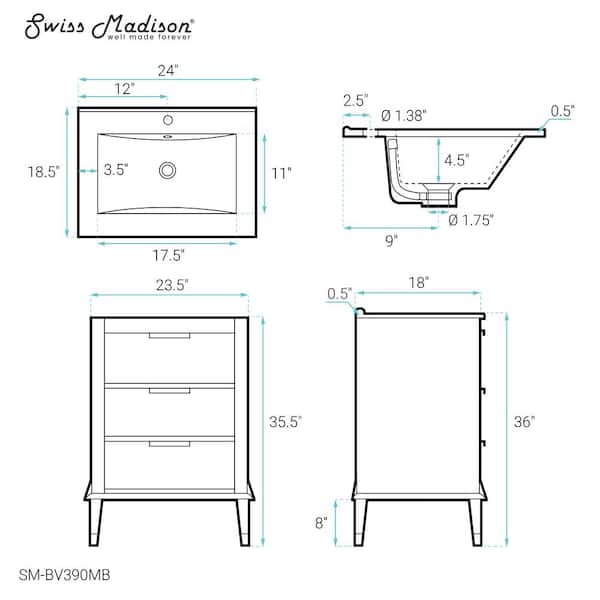 Hugo 24 in. W Bathroom Vanity in Brown Oak with Black Ceramic Sink Top
