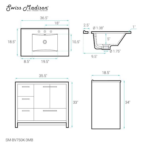 Virage 36 in. W Bathroom Vanity in Brown Oak with Black, 3-Hole Ceramic Sink Top