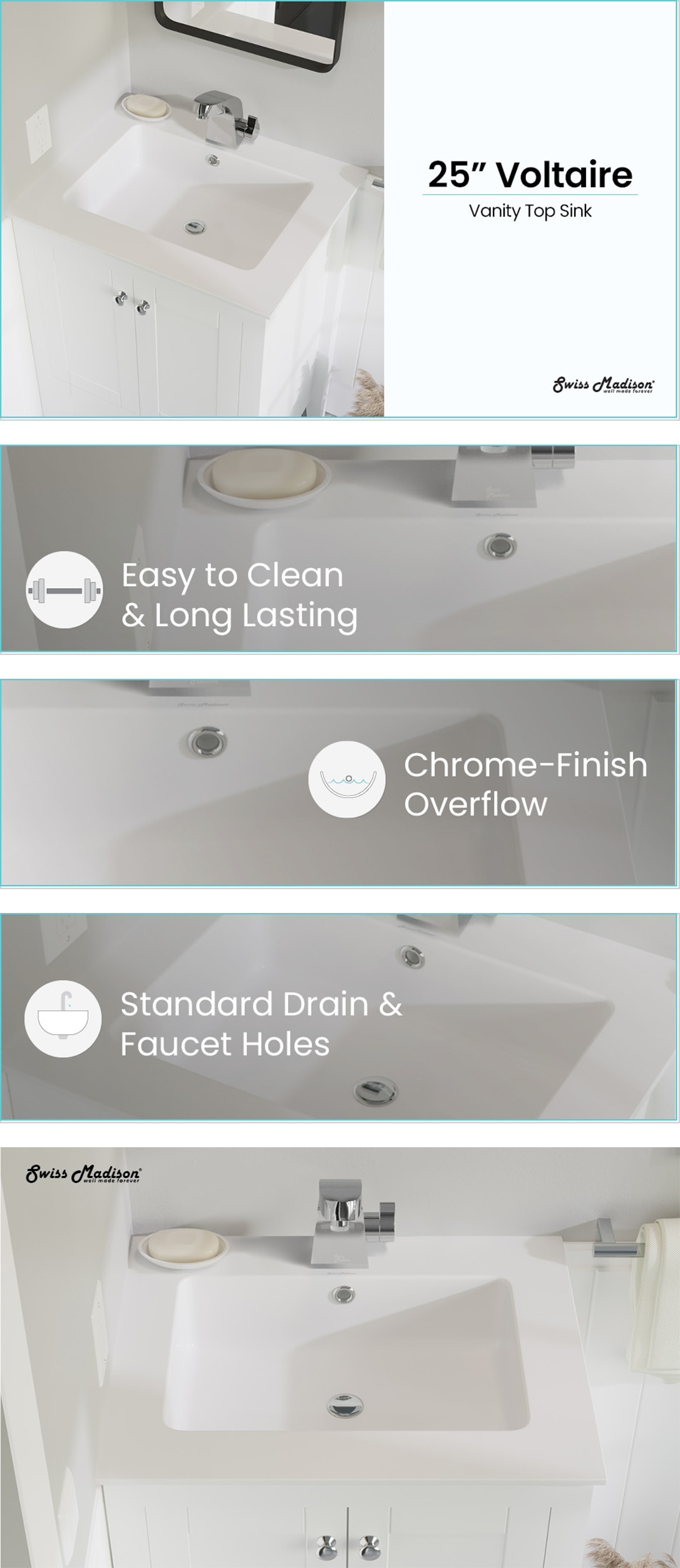 The Voltaire Vanity Top Sink combines ease of installation and a polished modern design into 1 single attractive package. The vanity top provides a smooth surface for everyday items before sloping gently into its spacious basin. A luxurious high gloss finish protects the sink from scratches and stains.