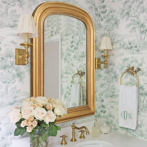 23.6 in. W x 33.5 in. H Ornate Baroque Brass Classic Finely Carved Wooden Frame Arched Wall Mirror