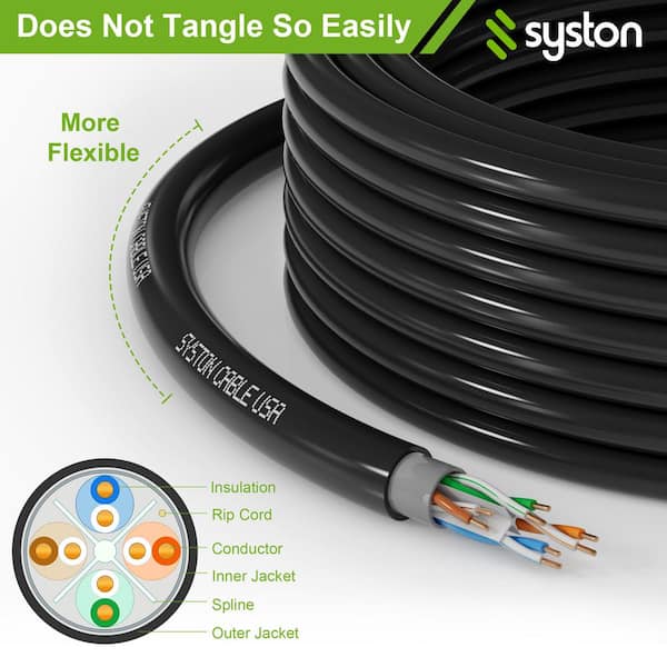 200 ft. CAT6A Direct Burial Ethernet Data Patch Cable Bare Copper Waterproof Dual-Layer for Outdoor Wet Locations-Black