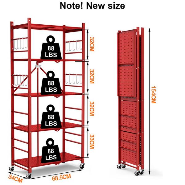 5-Tier Collapsible Storage Shelves Folding Pantry Shelves Wire Shelving in with 20 Hooks, Red