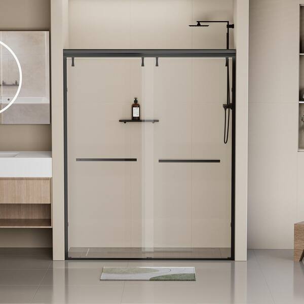 60 in. W x 76 in. H Double Sliding Semi-Frameless Shower Door in Matte Black Finish with Clear Glass