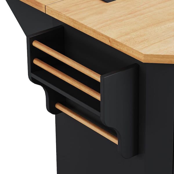 Black Kitchen Cart with Rubber Wood Veneer Drop Leaf, Power Outlet, Door Shelves, Wheels, Deep Drawers