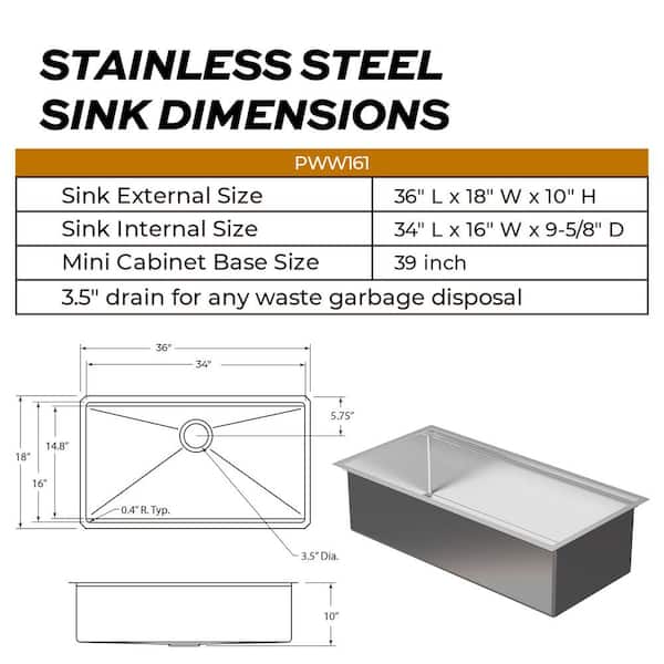 • 16 Gauge thick, made of premium T304 Series stainless steel