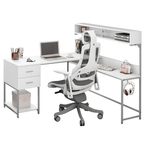 59 in. W L-Shape White Desk with Hutch and Storage Computer Desk