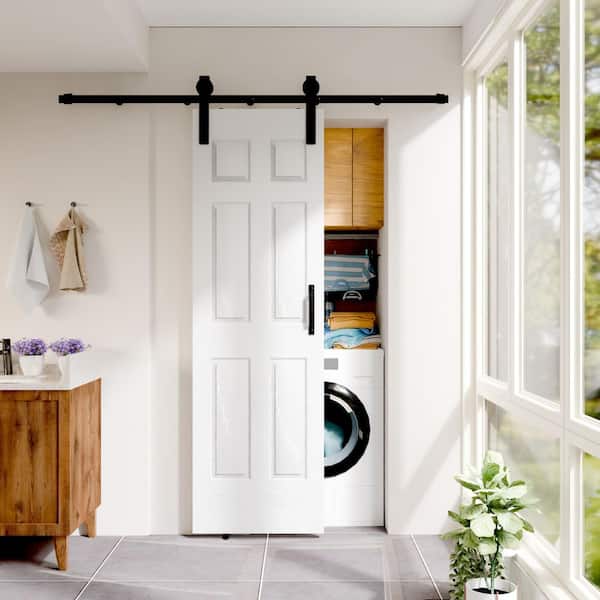 24 in. x 80 in. 6 Panel Hollow Core White Primed MDF Wood Sliding Barn Door Slab with Hardware Kit Set