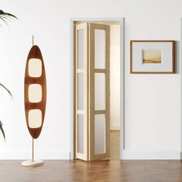 24 in. x 80 in. Frosted Glass Solid Core Light Brown 3-Lite MDF Wood PVC Covering Bi-fold doors with Hardware Kits