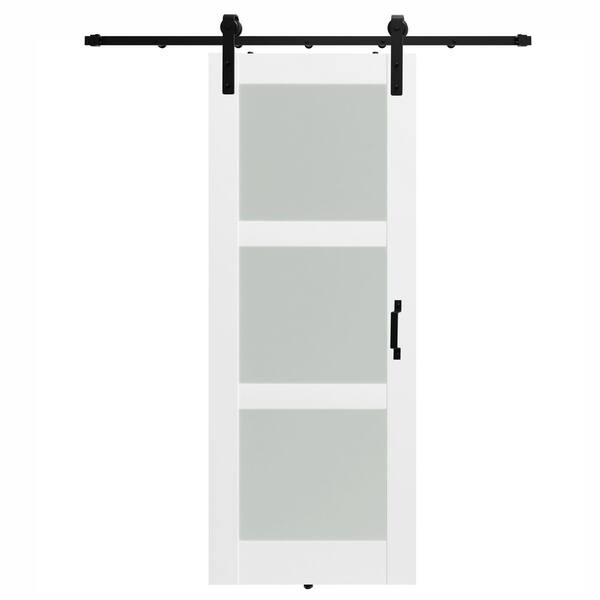24 in. x 80 in. White 3-Lite Frosted Glass Panel Solid Wood Barn Door Slab with Full Barn Door Hardware Kit