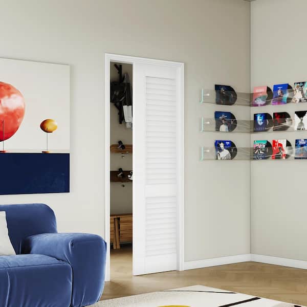 24 in. x 80 in. White Primed Louvered Panel Solid Wood Sliding Pocket Door with Soft Close, Frame and Hardware