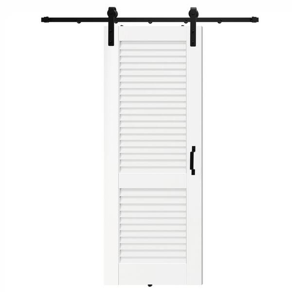 28 in. x 80 in. Louvered Panel Solid Core White Primed Pine Wood Sliding Barn Door Slab with Hardware Kit Set