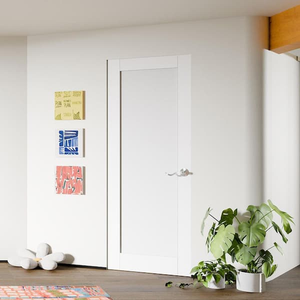 28 in. x 80 in. Solid Wood and MDF, Pre-assembled, White Primed, 1 Panel Interior Door Slab With Silver Curved Doorknob