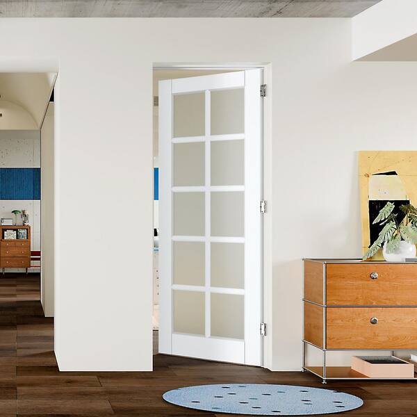 28in. x 80in. 10 Lite, Frosted Glass, White Primed, Composite Prehung Interior Door Right-Handed with Jamb and Hardware
