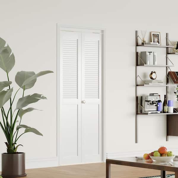 30 in. W. x 80 in. Solid Core, MDF Wood, White, PVC Covering, Half Louver Half Panel MDF Bi-fold Door with Hardware Kits