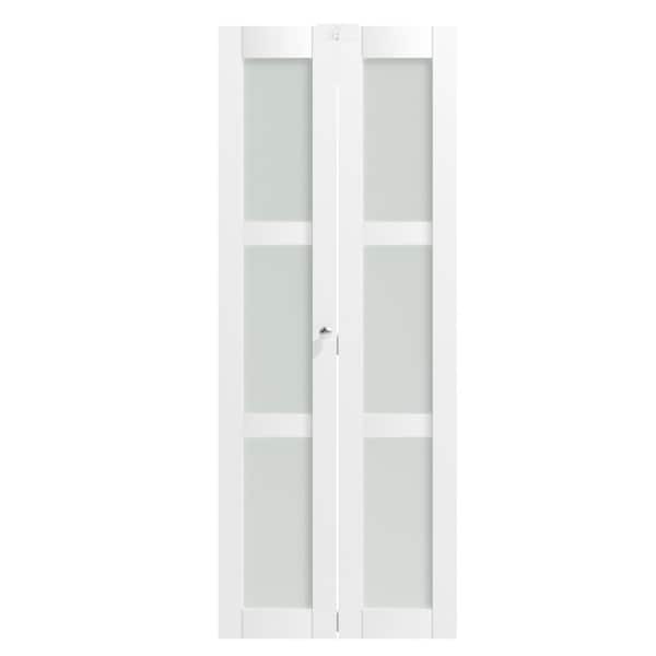 30 in. x 80 in. 3-Lite Frosted Glass Solid Core White PVC Covering MDF Bi-fold Doors with Locks and Handles