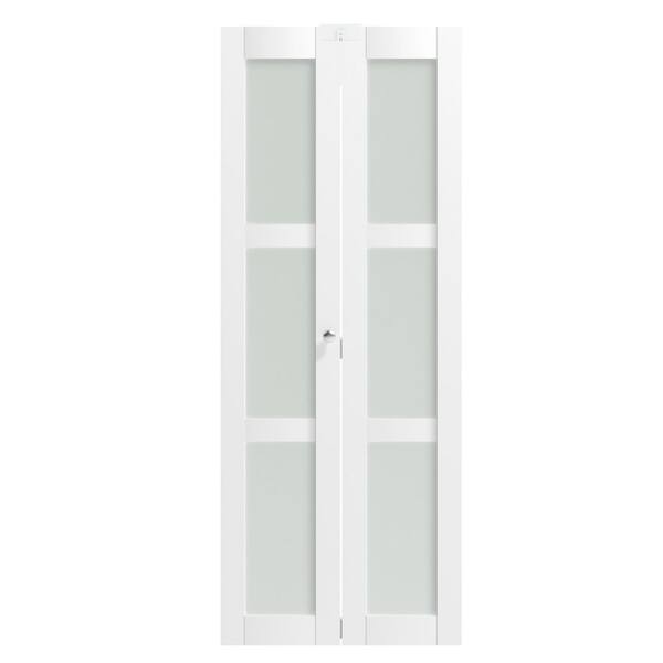 30 in. x 80 in. 3-Lite Frosted Glass Solid Core White PVC Covering MDF Bi-fold Doors with Locks and Handles