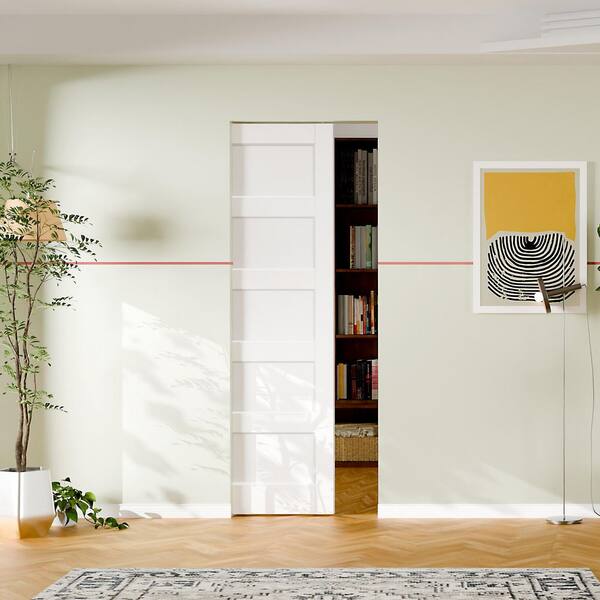 30 in. x 80 in. 5-Panel, Solid Core, DIY Painted, White Primed, MDF, Pre-Assembled Sliding Door with All Hardware