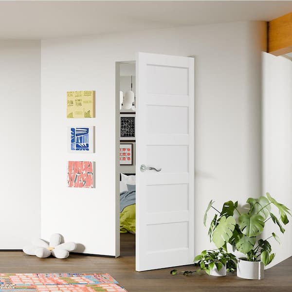 30 in. x 80 in. 5-Panel, Solid MDF Core, Composite, Primed, White, Interior Door Slab With Silver Curved Doorknob