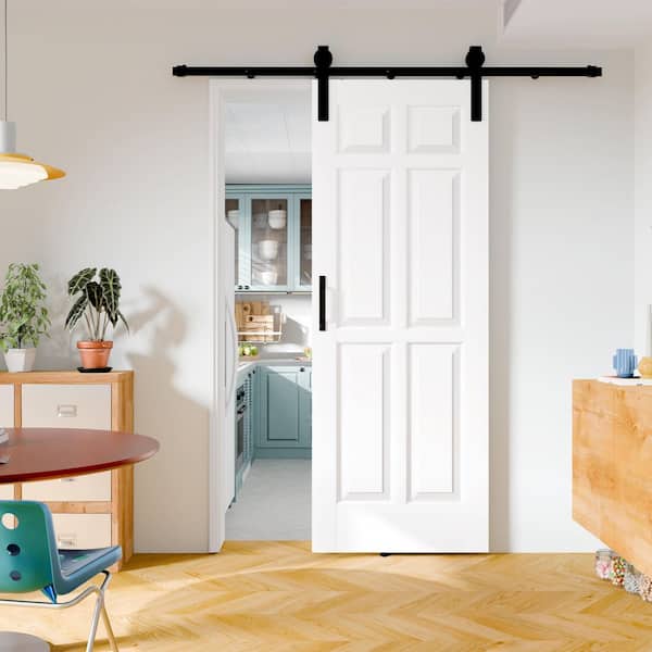 30 in. x 80 in. 6-Panel Solid Core White Primed Pine Wood Barn Door Slab with Hardware Kit Set, DIY Painted
