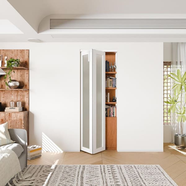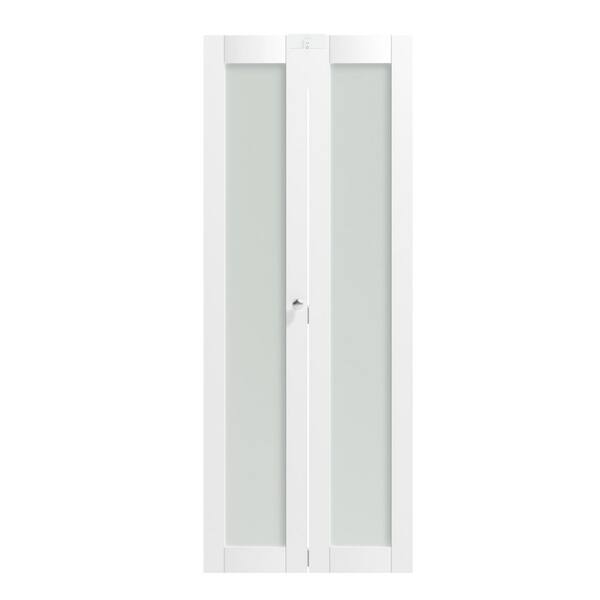30 in. x 80 in. Full Lite Frosted Glass Solid Core White PVC Covering MDF Bi-fold Door with Lock and Full Accessories