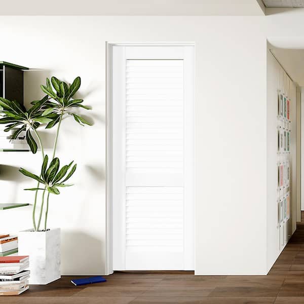 30 in. x 80 in. Louvered Panel, Composite White Primed, MDF Prehung Interior Door Left-Handed w/ Door Jamb and Hardware