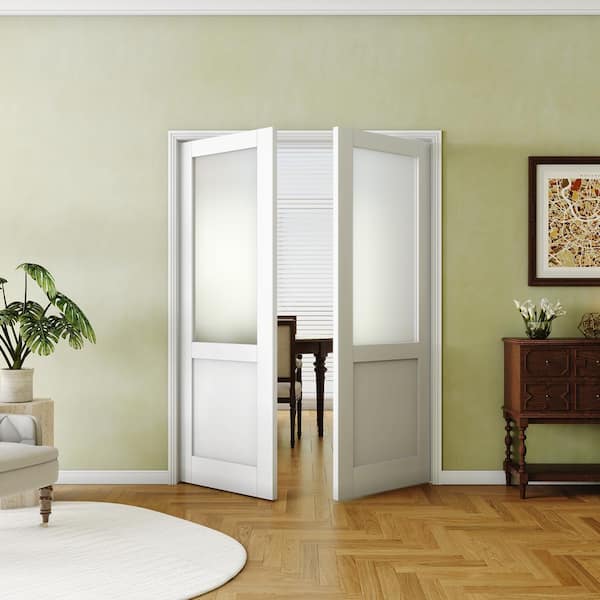 30 in. x 80 in. MDF 1/2-Lite Frosted Glass Solid White Primed, Standard Interior Door Manufactured Wood Double Slab