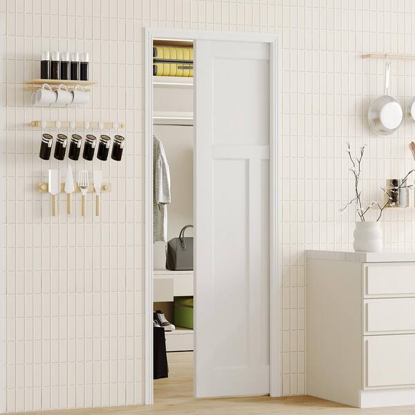 30 in. x 80 in. White Primed Composite T Shaped 3-Panels Core Pocket Door with Soft Close, Frame and Full Hardware Kit