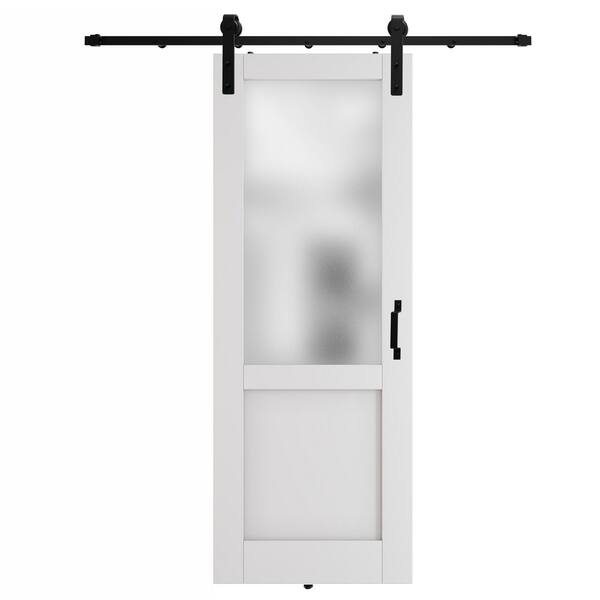 32 in. x 80 in. 1/2 Lite Frosted Glass White Primed Solid Core Pine Wood Barn Door Slab with Full Hardware Kit Set