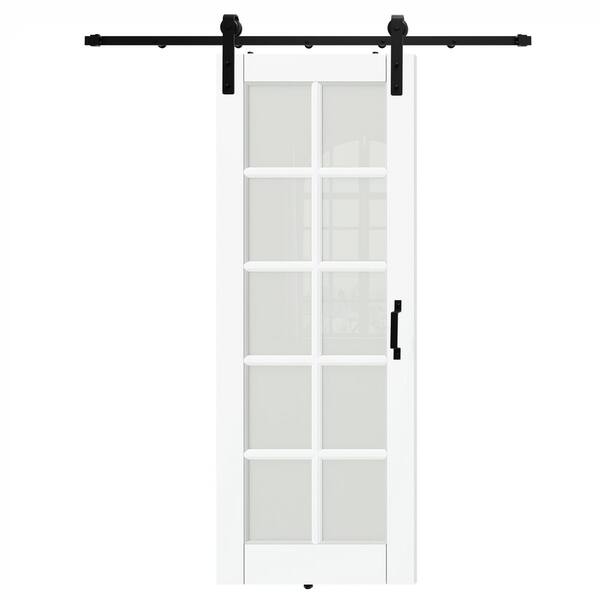32 in. x 80 in. 10-Lite Frosted Glass Solid Core White Primed Pine Wood Barn Door Slab with Hardware Kit Set
