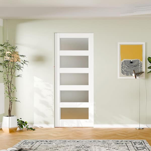 32 in. x 80 in. 5 Lite Frosted Glass, Solid Core, DIY Painted, White Primed, MDF Sliding Door with All Hardware