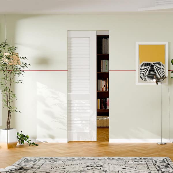 32 in. x 80 in. White Primed Louvered Panel Solid Wood Sliding Pocket Door with Soft Close, Frame and Hardware