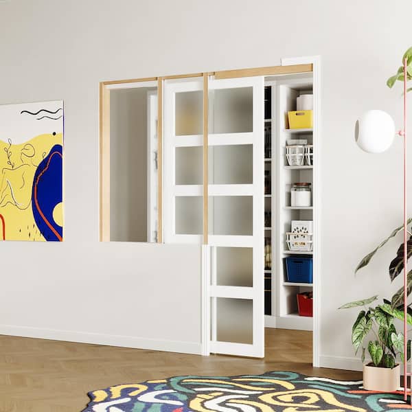 36 in. x 80 in. 5-Lite, Need to assemble Panel, Tempered Frosted MDF, White Primed Pocket Door Frame with Hardware