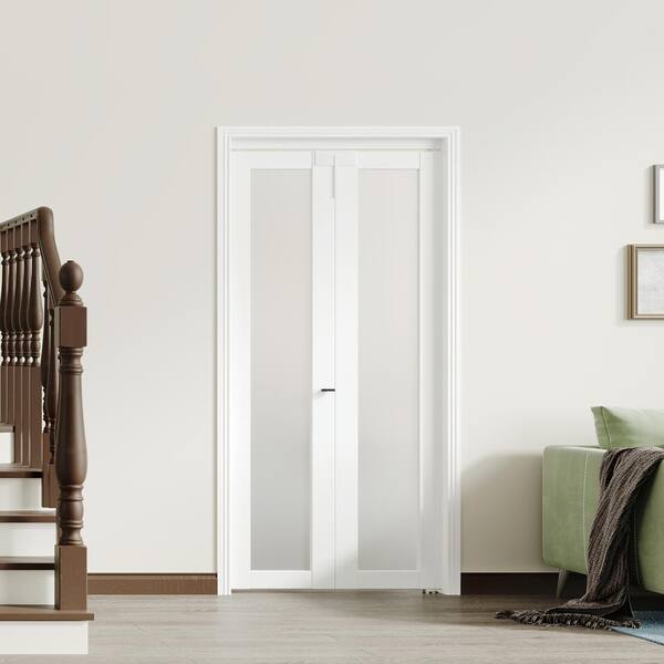 36 in. x 80 in. Frosted Glass Solid Core White Single Lite MDF Bi-fold Door with Lock, Handle and Hardware Kits