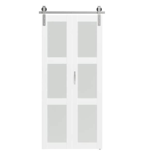 36 in. x 84 in. White, Finished, MDF, Frosted Glass Bi-Fold Style 3-Lite, Nickel Sliver Sliding Barn Door W/Hardware Kit