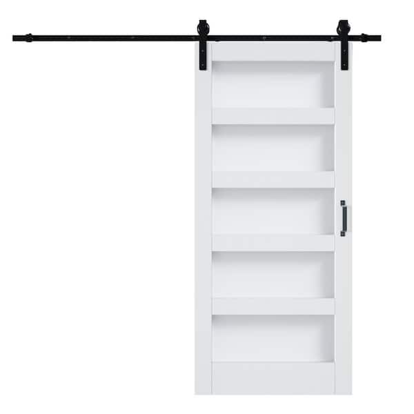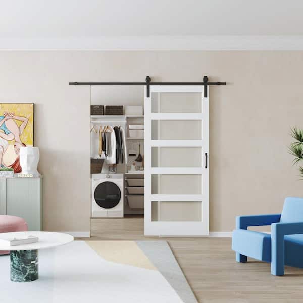 36 in. x 84 in. White, Finished, MDF, Frosted Glass, Primed, 5-Glass Panel Barn Door Slab with Barn Door Hardware