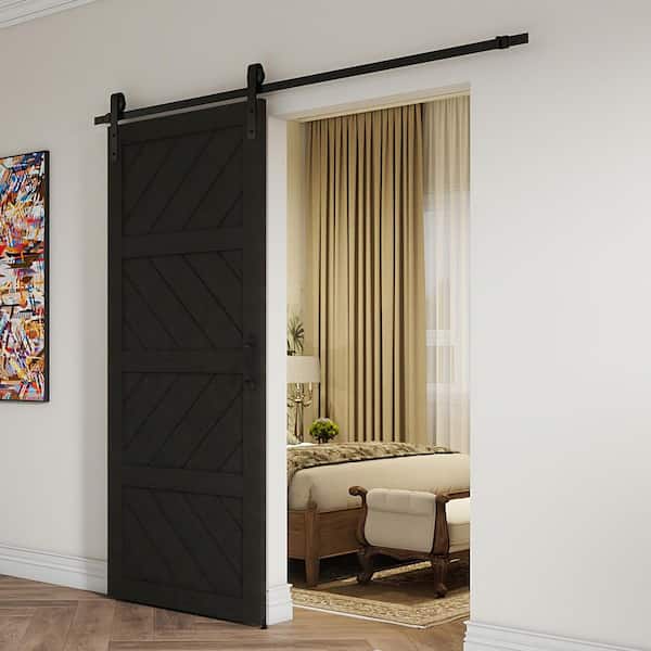 42 in. x 84 in. Black, MDF, 4 Panel Paneled Wood Wave, Water-Proof PVC Surface Sliding Barn Door with Hardware Kit
