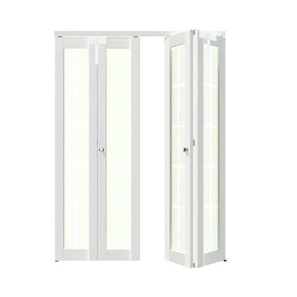 48 in. x 80 in. 10 Lite Decorative Frosted Glass Solid Core White PVC Covering MDF Bi-fold Doors with Full Accessories