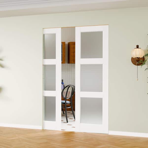 48 in. x 80 in. 3 Lite, Frosted Glass, Solid Core, DIY Painted, White Primed, MDF Sliding Door with All Hardware