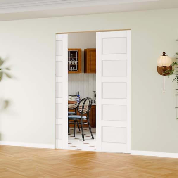 48 in. x 80 in. 5 Panel, Solid Core, DIY Painted, White Primed, MDF, Pre-assembled Sliding Door with All Hardware