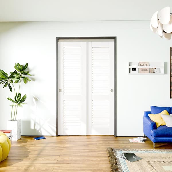 48 in. x 80 in. (Double 24 in.) Louvered MDF Wood, White Primed, Painted Pre-Finished Interior Door with Bypass Hardware