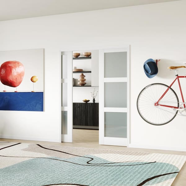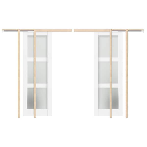 48 in. x 80 in. Double 24 in. W Doors 3 Lite Tempered Frosted Panel MDF White Primed Pocket Door Frame Hardware Included